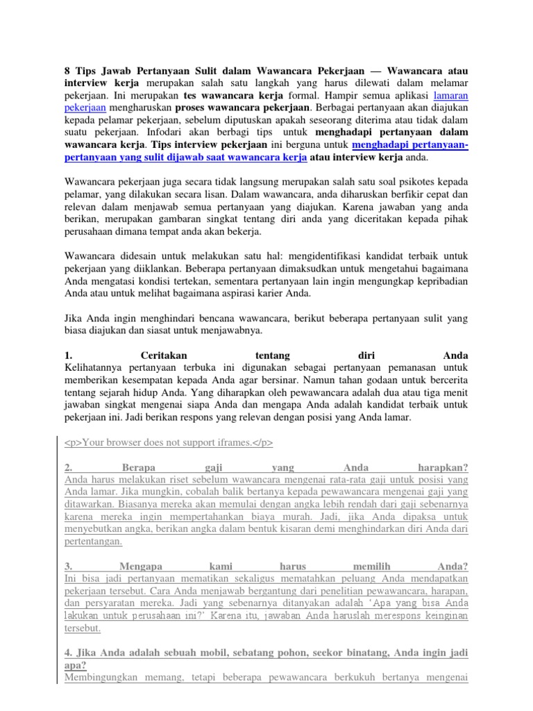Interview tips episode 1 soalan maut temuduga 3 jawapan perlu dielak semasa temuduga. Kenapa kami harus memperkejakan anda? Walaupun terdengar mudah, pertanyaan mengapa anda ingin bekerja di perusahaan kami sebenarnya dapat menjadi penentu apakah kamu akan diterima oleh perusahaan. Yang perlu dirubah mindsetnya adalah jenjang pendidikan s2 tidak menjamin anda mudah. Sebenarnya anda tidak perlu menghafal jawaban anda, tetapi anda harus memikirkan jawaban yang tepat sehingga paling tidaknya anda telah menjawab pertanyaan tersebut tanpa ragu dan gugup.
