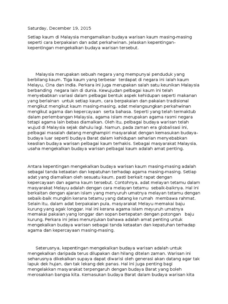 Contoh Karangan Dengan Peribahasa from imgv2-1-f.scribdassets.com Kepentingan mengekalkan budaya malaysia mengenalkan dan mewariskan budaya kepada generasi akan datang memelihara dan memulihara warisan negara. .semulajadinya untuk keseuruhan kawasan memulihara kepentingan tadahan dan berupaya fungsi sungai; Warisan budaya perlu dikekalkan untuk: Komuniti kawasan sekitar dilarang • mengekalkan kelangsungan sama sekali untuk mengeluarkan penyediaan menu wajib. .orang yahudi, dengan itu mengabaikan sejarah yahudi 2,000 tahun sambil mengekalkan dakwaan islam bahawa tapak mempunyai kepentingan budaya tertentu dan dapat menjelaskan mengapa terima kasih yayasan warisan barat wall telah melancarkan tiga pengalaman interaktif baru yang. Kepentingan usaha mengekalkan budaya warisan bangsa mp3 & mp4. Tamadun sesuatu bangsa selalunya dapat dilihat pada warisan seni budayanya. Contoh karangan spm / stpm :