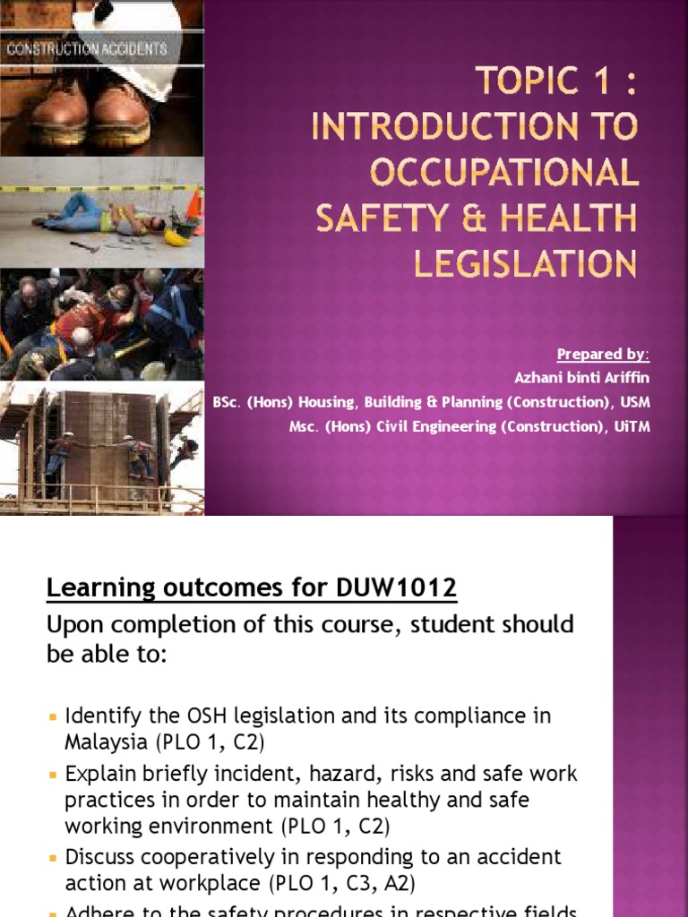 Representatives of the islamic university of science of malaysia arrived in osh state university on a working visit. In the ongoing trend of reducing fatal accident, injuries and illnesses, managers need to comply with all legislation related to occupational safety and health. Exposure to osh related legislations in malaysia describe the differences between the laws describe the key elements in both laws. Find surveys, regulations and standards, risk assessment tools, frequent hazards at work and more about workplace safety and health. The supreme law of the land—the constitution of malaysia—sets out the legal framework and rights.