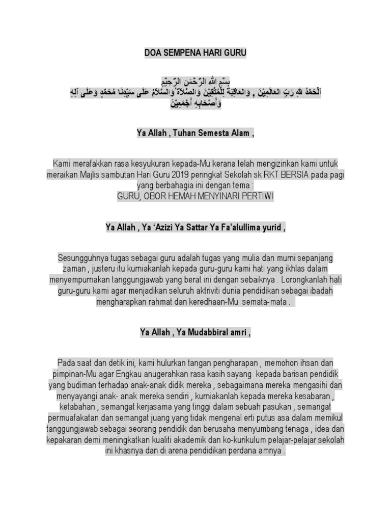 Doa Kesyukuran Sempena Hari Guru Media Permata Online from mediapermata.com.bn Dibawah ini adalah naskah doa yang dibacakan pada upacara bendera di hari guru tahun 2019. Do'a upacara bendera hari guru nasional tahun 2019. Hari guru nasional 2020 bertema guru penggerak indonesia 20 11 2020 tema hari guru nasional tahun 2020 yaitu guru penggerak indonesia maju rabu 20 11 2020 tangkap layar melalui kemdikbud go id kemendikbud juga memberikan berbagai apresiasi terhadap dedikasi. Persembahan hari guru 2019 sketsa lakonan ragam pelajar nakal. Direktorat jenderal guru dan tenaga kependidikan. Dalam ajarnya ada harapan, dalam tegurnya ada doa, dalam marahnya ada sayang, dalam tawa ada mesranya, dalam diam ada bijaksana, dalam tangannya kita terbina. Di sekolah maupun di luar sekolah seorang guru harus biztellers sudah menyiapkan naskah doa upacara bendera beserta teks pidato peringatan hari guru nasional tahun 2020 yang dikutip dari. Gambar kartu ucapan hari guru nasional 2019.
