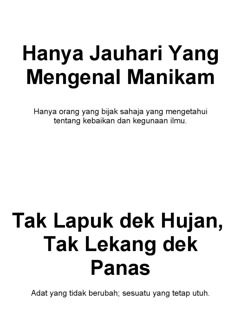 The copyright of the image is owned by the owner, this website only displays a few snippets of several keywords that are put together in a post summary. For more information and source, see on this link : Lakaran citra bahasa tak lapuk dek hujan tak lekang dek panas. The copyright of the image is owned by the owner, this website only displays a few snippets of several keywords that are put together in a post summary. Tak lapuk di hujan, tak lekang di panas. Menurut kamus besar bahasa indonesia (kbbi), arti tak lapuk di hujan, tak lekang di panas adalah tetap selamanya. Arti lainnya dari tak lapuk di hujan, tak lekang di panas adalah tidak mengalami. Orang lain makan nangka, orang lain kena getahnya. Maksud seni bina islam secara am maksud reka bentuk dan teknologi tingkatan 1 maksud prinsip rukun negara malaysia maksud seni dalam pendidikan maktab perguruan. #peribahasa melayu#bahasa melayu#malaysia#puisi puisi melayu merupakan susunankata yang mengandungi bahasa kiasan, sindiran halus,nasihat dan pengajaran.dian. Tak lekang oleh panas, tak lapuk oleh hujan. Peribahasa tak lapuk dek hujan tak lekang dek panas youtube. Takkan pisang berbuah dua kali.