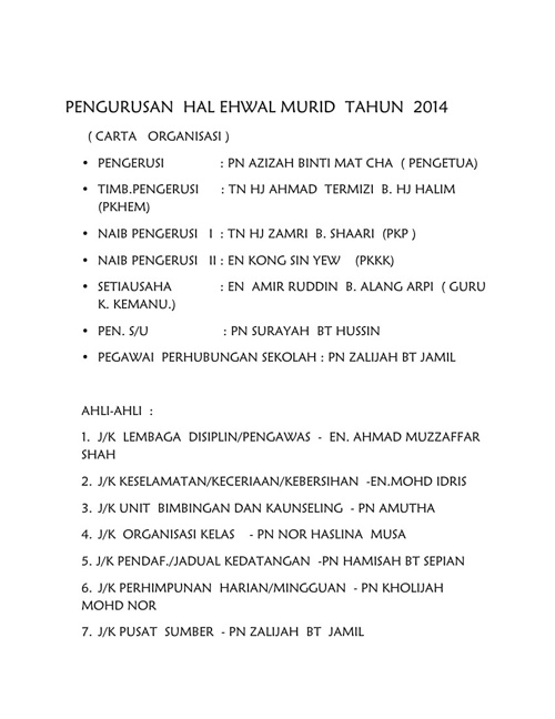 Download Contoh Struktur Organisasi Kelas Yang Kreatif Berbagai Struktur from 0.academia-photos.com Contoh carta organisasi kokurikulum sekolah rendah via contoh317.blogspot.com. Sekolah menengah kebangsaan bukit kuang, 24000 kemaman, terengganu. Carta organisasi kelas peranan ahli jawatan kuasa organisasi pendidikan belajar. Carta organisasi kelas tahun 2 2016. Penolong pengarah pengurusan projek khas/sbp/kluster. Jalan port dickson, 70300 seremban. Paling inspiratif dekorasi asmaul husna di kelas panda ed. Carta organisasi ujian lisan berasaskan sekolah (ulbs) 2018.