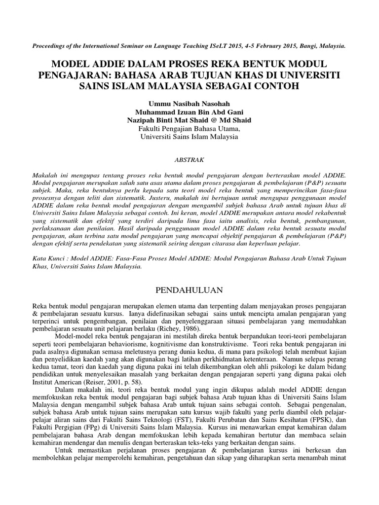 Dibangunkan sendiri, dan dilaksanakan dalam p&p bahasa arab menggunakan model addie. Model ini adalah salah satu model desain pengembangan bahan ajar yang terdiri atas lima tahap, yaitu: Analisis, desain, development atau pengembangan, implementasi, dan evaluasi. Terdapat dalam bahasa melayu adalah berbeza dengan struktur ayat yang terdapat dalam Pbsmi pengajaran pembelajaran sains dan matematik dalam bahasa inggeris utm universiti teknologi malaysia.